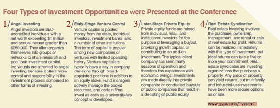 Event participants were able to sit in on panel discussions by representatives from notable Michigan investment firms on topics including angel investing, later-stage private equity, early-stage venture capital, and real estate syndication. John Kerschen, managing director of the Michigan Accelerator Fund-1, noted that each form of investing provides unique advantages and risks. Questions ranged from investment time frames to levels of returns expected to the role an investor plays in the investments a fund will pursue. Panelists stressed the importance of knowing who the investor will be working with, whether that be a fund manager, property manager, or fellow angel investor.