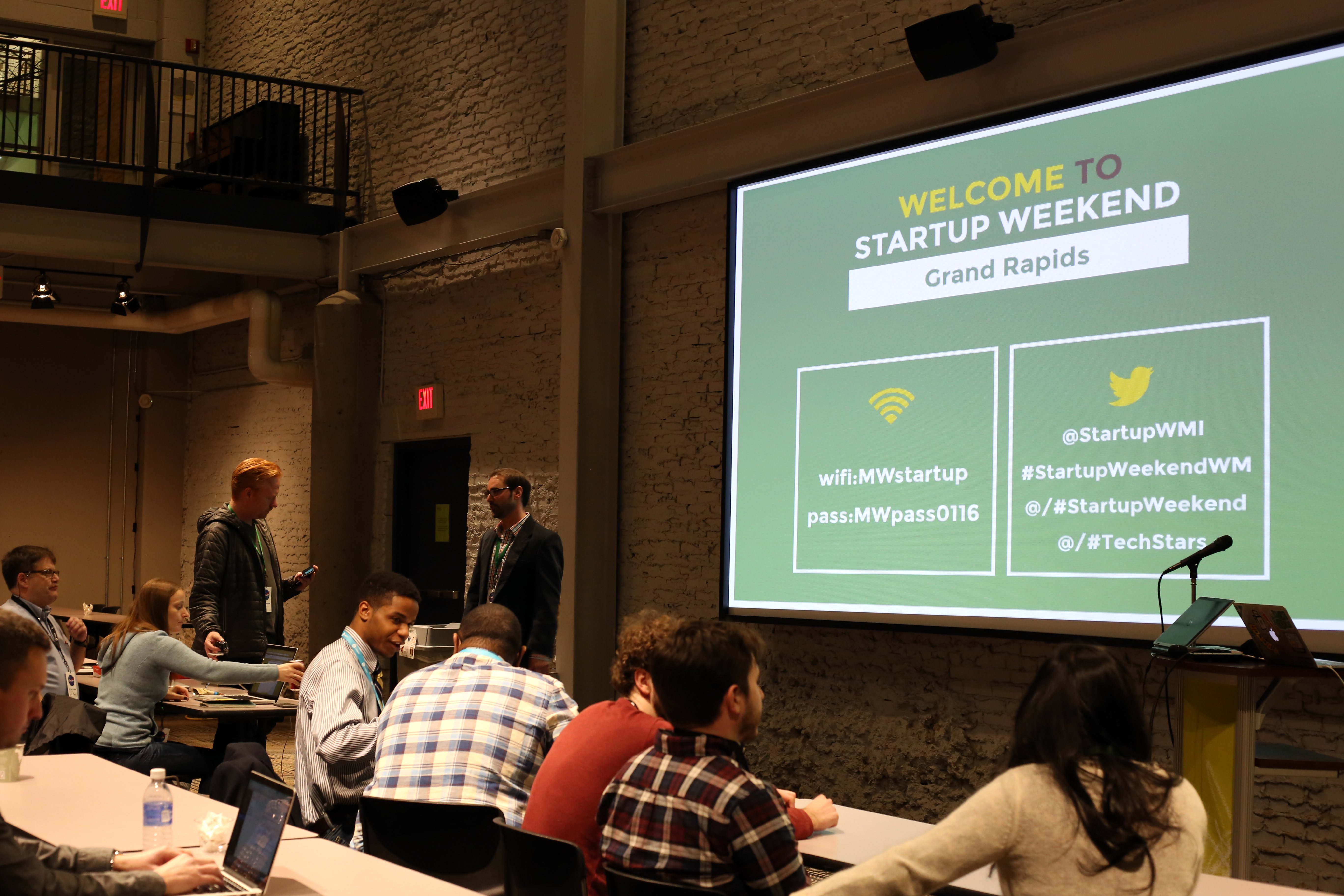 Startup Weekend West Michigan continues today with more than a dozen teams working on developing a range of ideas, including an exterior mounted snow scraper, super food packets for smoothies and a card game that combines monopoly and goldfish.