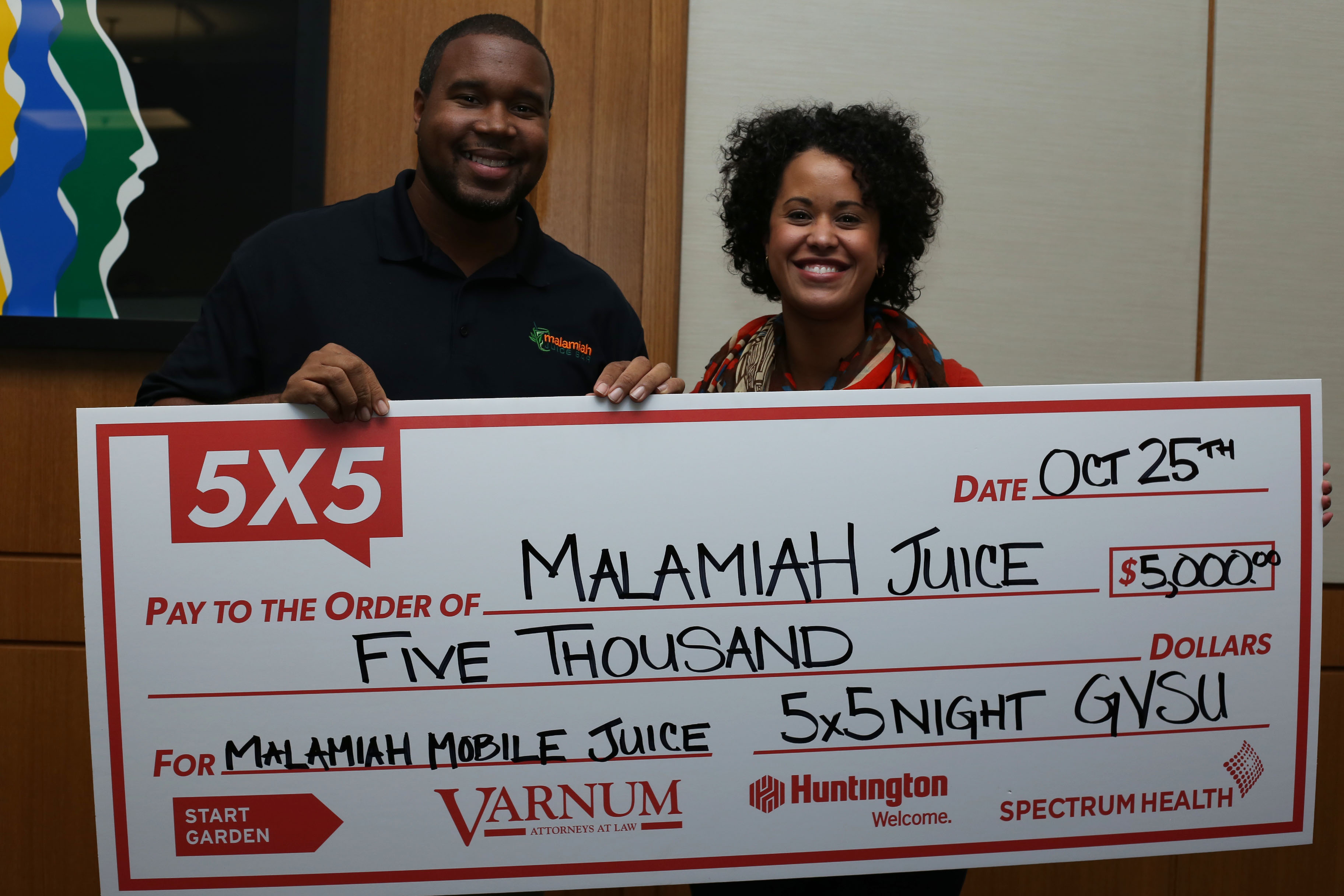 Jermale Eddie of Malamiah Juice Bar took home the $5,000 cash prize along with $5,000 in legal services from Varnum Law at this month’s 5×5 Night, held on Tuesday in the Loosemore Forum at the Siedman College of Business at GVSU. Malamiah Juice Bar is located in the Downtown Market, and the $5,000 will go towards purchasing a truck to add a mobile competent to their business. Neu will be following up with Eddie next month to check on the impact of the $5,000.