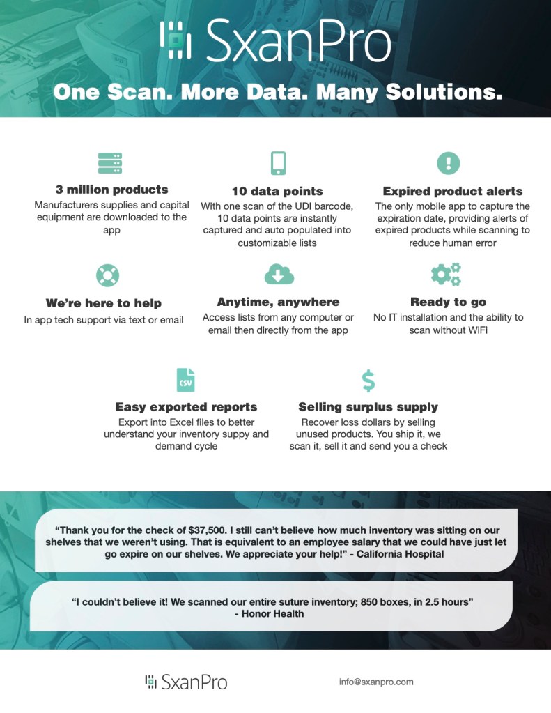 SxanPro is a mobile app that scans the manufacturer barcode on medical devices and supplies to capture product information including expiration date, lot number and manufacturer. This data is then used to help hospitals, medical device companies, and retailers make decisions about inventory they have that may be surplus or expiring.