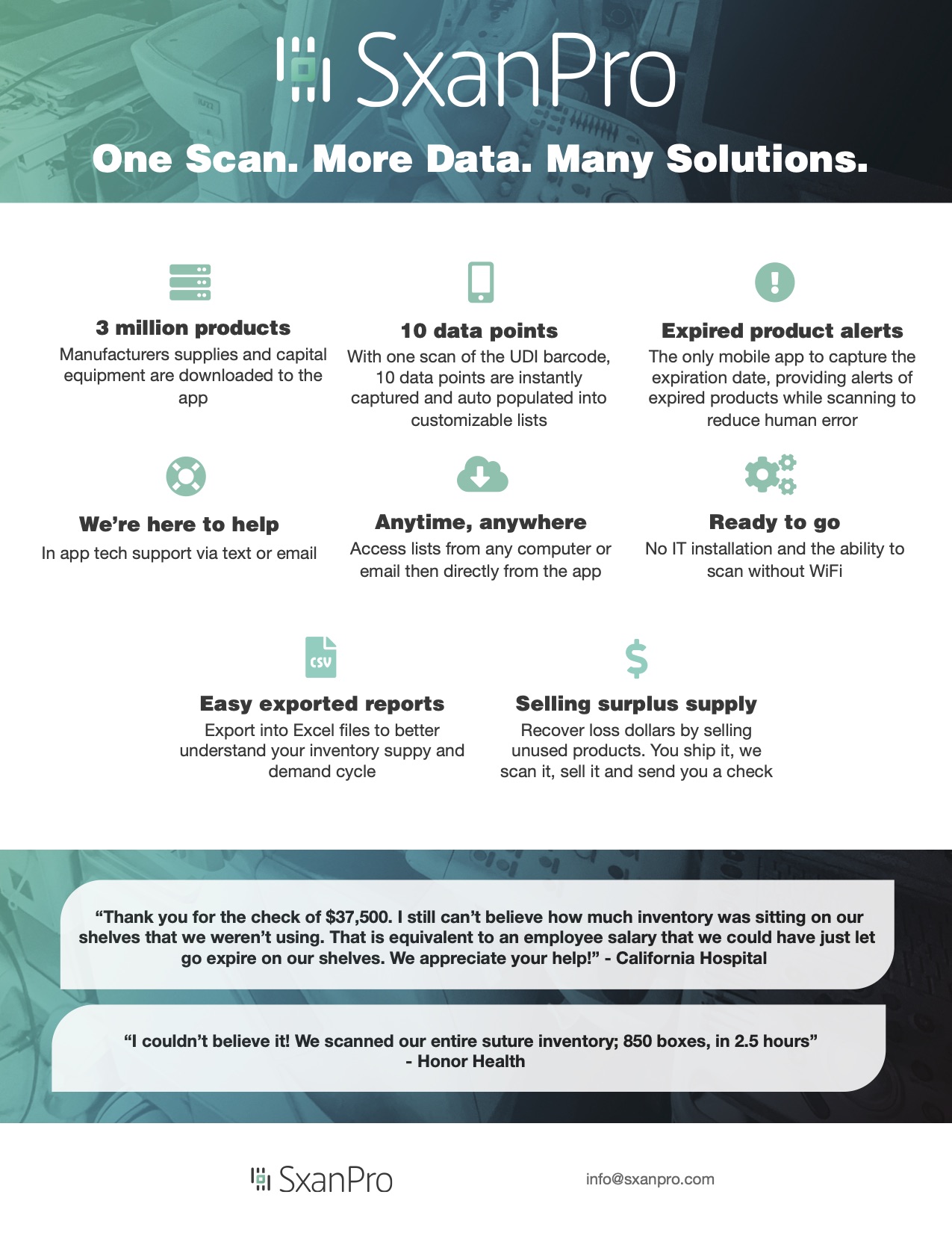 SxanPro is a mobile app that scans the manufacturer barcode on medical devices and supplies to capture product information including expiration date, lot number and manufacturer. This data is then used to help hospitals, medical device companies, and retailers make decisions about inventory they have that may be surplus or expiring.