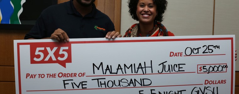 Jermale Eddie of Malamiah Juice Bar took home the $5,000 cash prize along with $5,000 in legal services from Varnum Law at this month's 5x5 Night, held on Tuesday in the Loosemore Forum at the Siedman College of Business at…